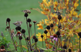 After the flowers are gone, they still provide a lot of excitement. Here in early October, what a great sight to see finches feeding on the native flowers that have gone to seed. There appears to be both Goldfinches as well as Pine Siskins.